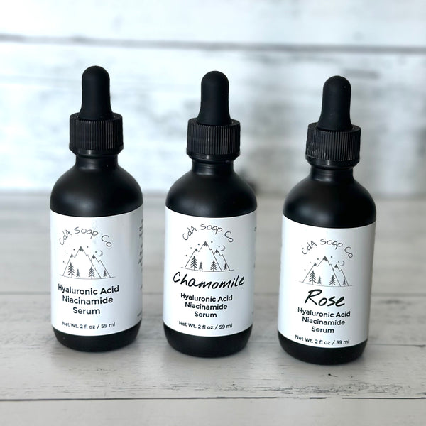 • Hyaluronic Acid + Niacinamide Serum (choose your variant) A lightweight, fast-absorbing serum that plumps, brightens, and balances. Powered by hyaluronic acid, niacinamide, and your choice of calming hydrosols, it’s ideal for layering and daily use.